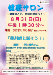8月31日、長野県小諸市立小諸図書館と一緒に「健康サロン」を開催し、お話をさせていただきました。テーマは「薬剤師と話そう!」です。